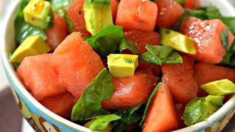 Semangka yang banyak mengandung air dan alpukat dengan dagingnya yang lembut ternyata bisa disatukan menjadi hidangan yang nikmat. Campur potongan semangka dan potongan alpukat di dalam satu mangkuk. Siramlah dengan dressing favorit. Tambahkan dengan perasan air jeruk lemon. Sajian yang menyegarkan dan sehat ini bisa jadi alternatif appetizer makan malammu yang menyenangkan.