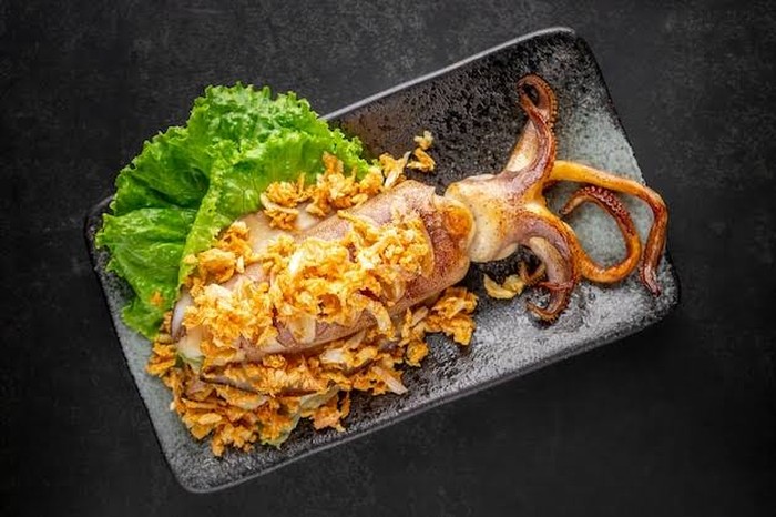 Pla muek yang adalah salah satu jajanan street food Bangkok yang wajib kamu coba, terutama jika kamu penggemar seafood. Hidangan ini berupa cumi-cumi panggang yang dipotong-potong dan disajikan dengan saus pedas khas Thailand.