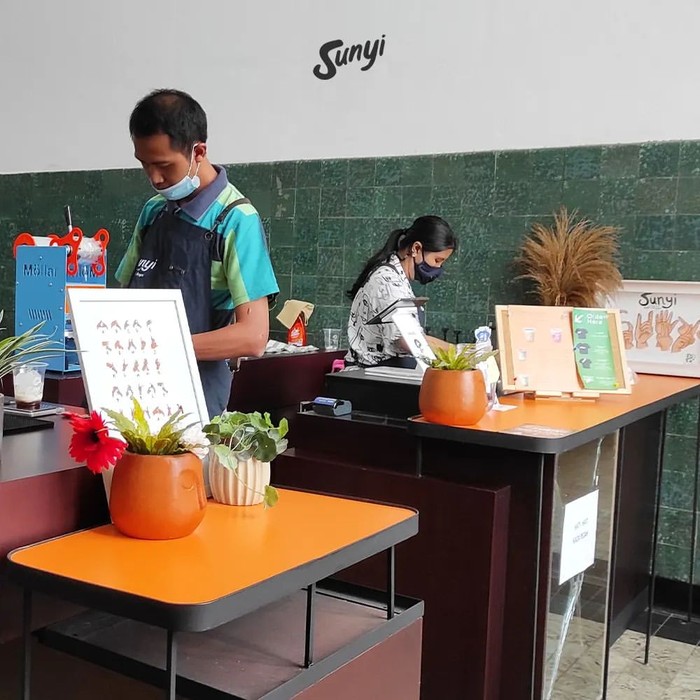 Sunyi Coffe menjadi salah satu kafe yang mempekerjakan penyandang disabilitas sebagai barista, chef, hingga pelayan. Kafe yang sudah berdiri sejak tahun 2019 ini terletak di kawasan Barito, Jakarta Selatan.