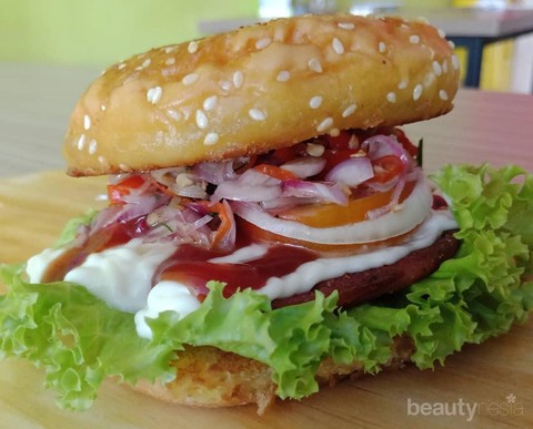 Menu terakhir adalah burger sambal matah. Biasanya menggunakan saos mayonais atau saos sambal. Tapi kali ini menggunakan potongan bawang dan cabai segar khas sambal matah sebagai saus alami yang akan menciptakan rasa pedas. Kamu bisa menambahkan isian protein sesuai selera kamu, seperti chicken maupun beef.