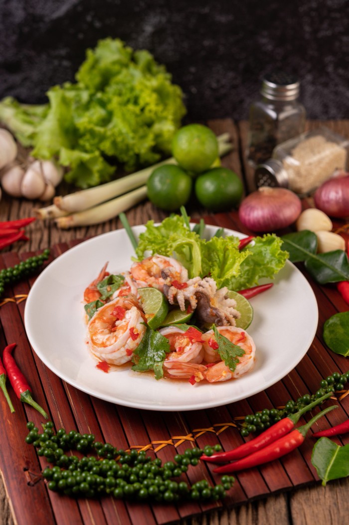 Seafood yang digunakan dalam salad ini mencakup udang, salmon, cumi-cumi, gurita, dan kadang-kadang ada tambahan topping seperti kepiting atau rajungan mentah. Banyak konten kreator terkenal yang telah berbagi momen mereka saat mencicipi salad Thailand ini.