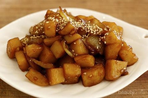 Hidangan yang satu ini merupakan salah satu hidangan yang dikeluarkan sebagai banchan. Perpaduan rasa manis asin yang menyerap sempurna pada kentang yang empuk cocok dimakan panas-panas untuk menghangatkan tubuh yang kedinginan. Hidangan ini banyak digemari mulai dari anak kecil hingga orang dewasa.