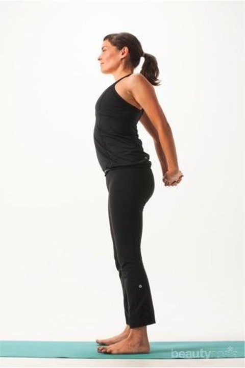 Kembali kepada Mountain pose. Setelah itu, satukan jemari ke belakang dan tarik tubuh perlahan untuk melemaskan bagian pantat, bahu dan lengan secara bersama-sama. Dorong panggul ke depan lalu dekatkan dagu dengan dada sembari menatap ke atas. Cobalah untuk menikmati setiap detik dan atur napas sesuai dengan ritme alami. Tarik napas dan kembali ke Mountain Pose.
