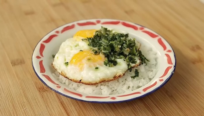 • Siapkan nasi putih, tuang telur dan tumisan daun bawang di atasnya. Tambahkan irisan cabai rawit bila suka