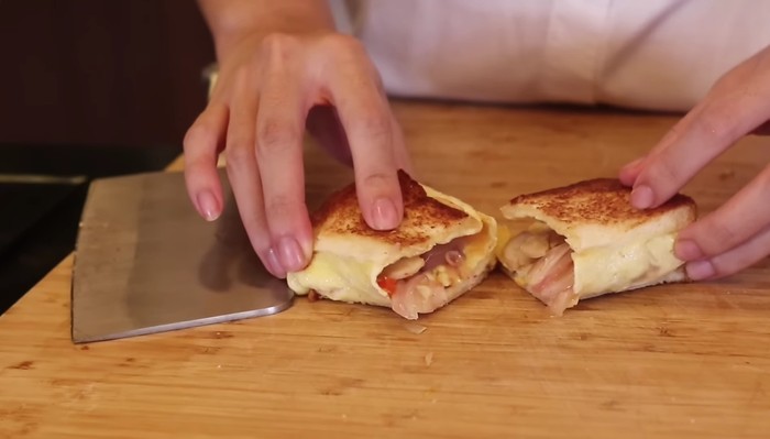 • Lipat telur ke dalam sesuaikan dengan lebar roti. Lalu lipat roti agar membentuk sandwich