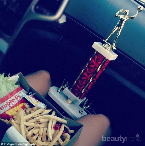 Foto: https://www.dailymail.co.uk/tvshowbiz/article-2927779/Gigi-Hadid-takes-aim-modeling-industry-s-pressure-named-Model-Year.html Gigi tak akan meninggalkan hamburger dan kentang goreng favoritnya hanya karena dia seorang supermodel. Minasan juga berhak untuk makan makanan favorit Minasan untuk merasa bahagia. Tapi jangan keterusan dan melupakan tujuan utama diet, ya!