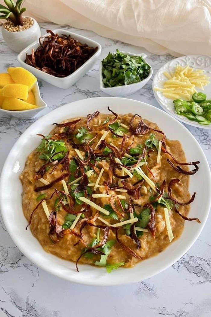 Haleem yang autentik menyajikan daging domba atau kambing yang dimasak lama dengan campuran lentil, gandum, dan rempah-rempah. Hidangan ini memiliki banyak nutrisi, tinggi kalori, dan menjadi makanan wajib saat Ramadan. Sementara, di Pakistan, haleem biasanya dimakan dengan naan atau roti pipih yang mirip dengan roti canai.