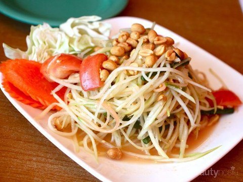 Bagi kamu pecinta salad, kamu wajib mencoba Som Tam. Som Tam adalah pepaya muda yang diolah menjadi salad yang lezat. Kuliner Thailand yang banyak didominasi dengan rasa yang pedas dan asam, salah satunya terdapat pada menu yang satu ini. Pepaya muda yang diiris tipis disajikan bersama dengan ketan, bihun dan ayam panggang serta disiram dengan saus ikan, bumbu kacang, bawang putih, cabai, tomat serta lemon untuk menambah kesegaran Som Tam.