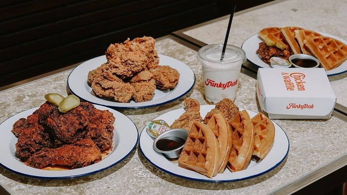 Ingin makan waffle dan chicken sekaligus? Harus coba Funky Dak. Kuliner yang satu ini menyajikan waffle lezat dengan fried chicken. Menu waffle bisa dinikmati dengan sirup maple yang manis. Sedangkan untuk fried chicken tersedia beberapa varian seperti buttermilk fried chicken dan Nashville Hot Chicken.