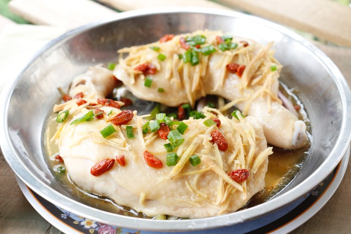 Selain ikan, ayam utuh juga jadi simbol keluarga. Seekor ayam mengandung protein tinggi dan cukup untuk dimakan seluruh keluarga. Hal itu melambangkan kebersamaan dan kelahiran kembali. Untuk mengungkapkan rasa syukur, orang Tionghoa akan memisahkan bagian kepala dan cakarnya.
