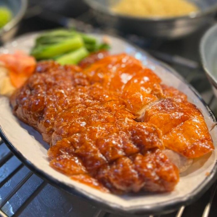 Bebek panggang di restoran ini sekilas mirip dengan sajian bebek asal Negeri Tirai Bambu. Daging bebek diiris tipis, lalu disajikan bersama nasi serta siraman saus kental dengan rasa rempah yang kuat.