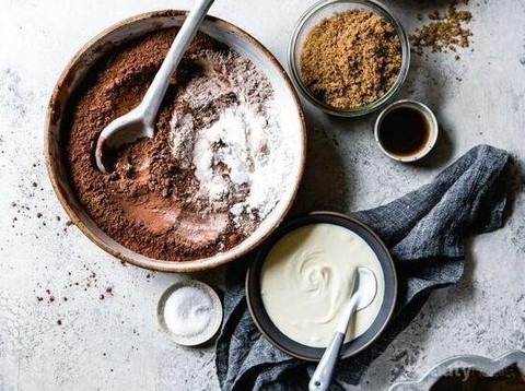 - Siapkan bahan kering dengan mencampurkan tepuk terigu, baking powder dan cokelat bubuk. Aduk hingga tercampur.