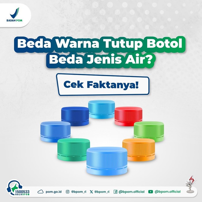 Dilansir dari detikhealth, Badan Pengawas Obat dan Makanan (BPOM) menegaskan bahwa informasi tersebut tidak benar alias hoaks. Beragam warna tutup botol air minum dalam kemasan (AMDK) di Indonesia tidak menggambarkan proses dan dari mana sumber air berasal. Sehingga, tidak ada hubungan antara warna tutup botol dengan jenis atau sumber airnya.