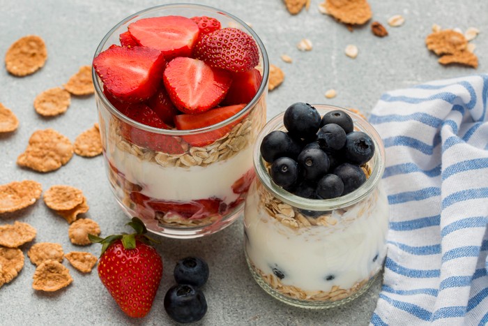 Tidak berbeda dengan coklat bar, cara mengolah buah satu ini juga cukup mudah dan seru untuk dicoba. Kamu hanya perlu mencampurkan potongan buah ke dalam semangkuk yogurt. Pilihlah jenis greek yogurt yang lebih sehat tanpa tambahan gula.