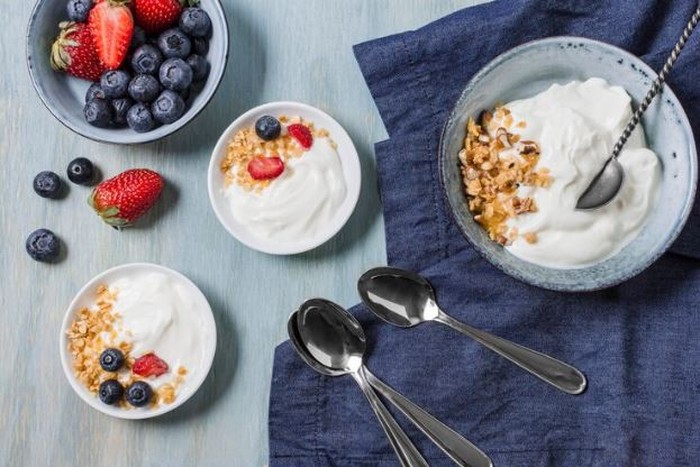 Kalau kamu suka ngemil di sela-sela aktivitas, coba deh ganti cemilan kamu dengan Greek yogurt. Greek yogurt mengandung dua kali lipat protein dibanding yogurt biasa. Dalam 250 gram Greek yogurt, terkandung sekitar 10-20 gram protein. Selain tinggi protein, greek yogurt juga mengandung probiotik yang baik untuk pencernaan.