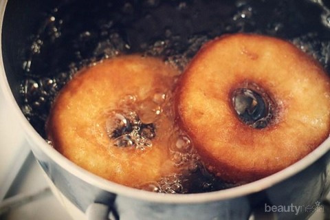 6. Goreng donat dengan api kecil minyak panas, cukup sekali balik dan jangan sering di intip bawahnya
