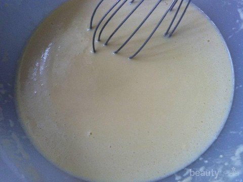 Buat kulit sosis: Siapkan mangkuk besar masukkan telur lalu kocok. Tambahkan garam, minyak, aduk rata. Masukkan tepung terigu bergantian dengan air, aduk sampai licin lalu saring.