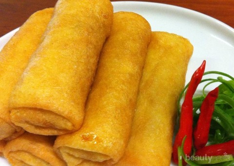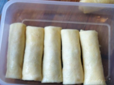 4. Ambil selembar kulit sosis lalu isi dengan bahan isian, lipat lalu celupkan kedalam putih telur lalu goreng di minyak panas api sedang sampai kuning kecoklatan