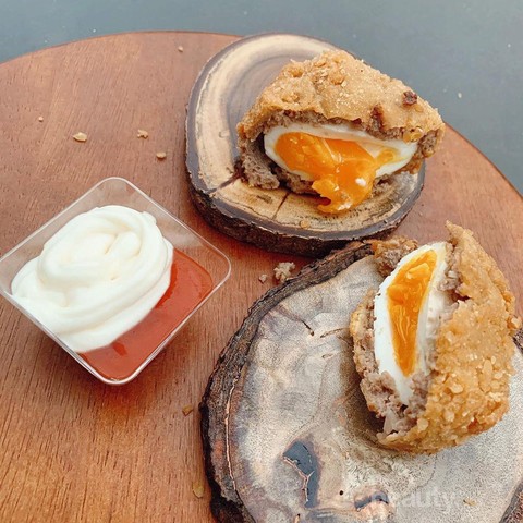 Yang terakhir adalah scotch egg. Scotch egg ini terdiri daging saping yang dicincang halus, tepung roti dan telur lalu digoreng dengan tepung roti merupakan kombinasi yang sempurna dan lezat dengan telur bagian kuning yang masih setengah matang. Scotch egg ini bisa dicocol dengan saus mayonas dan sambal botol pedas. Setiap gigitan dari scotch egg ini akan lumer dimulut dari telur setengah matang tersebut.