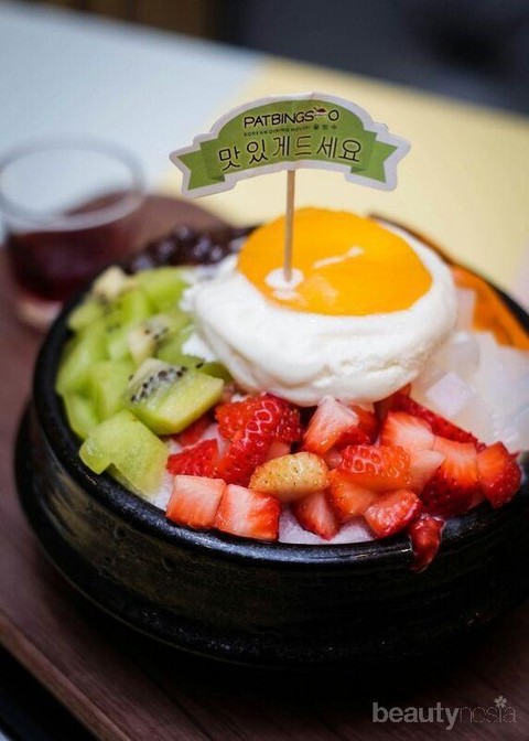 kalo kamu Korean cuisine lovers, pas banget soalnya Patbingsoo menyediakan es serut ala Korea yang platingnya lucu dan enak banget. Salah satu menu yang paling menarik perhatian adalah Bibim Patbingsoo yang bentuknya mirip banget kayak Bibimbap, sampai ada bagian yang dibuat mirip seperti sunny side up khas Bibimbap. Padahal Bibim Patbingsoo sebenarnya adalah es serut yang disajikan dengan strawberry, kiwi, Nata de coco, jelly, dan kacang merah.
