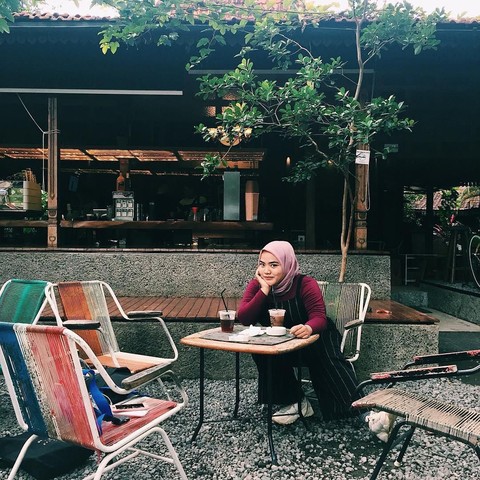 outdoor dengan desain interior yang klasik dan nyaman. Untuk menadapatkan suasanya yang oke buat foto Instagram kamu, coba deh datang ke sini saat sore menjelang malam karena warung kopi cantik dihasi oleh lampu-lampu yang menyala.