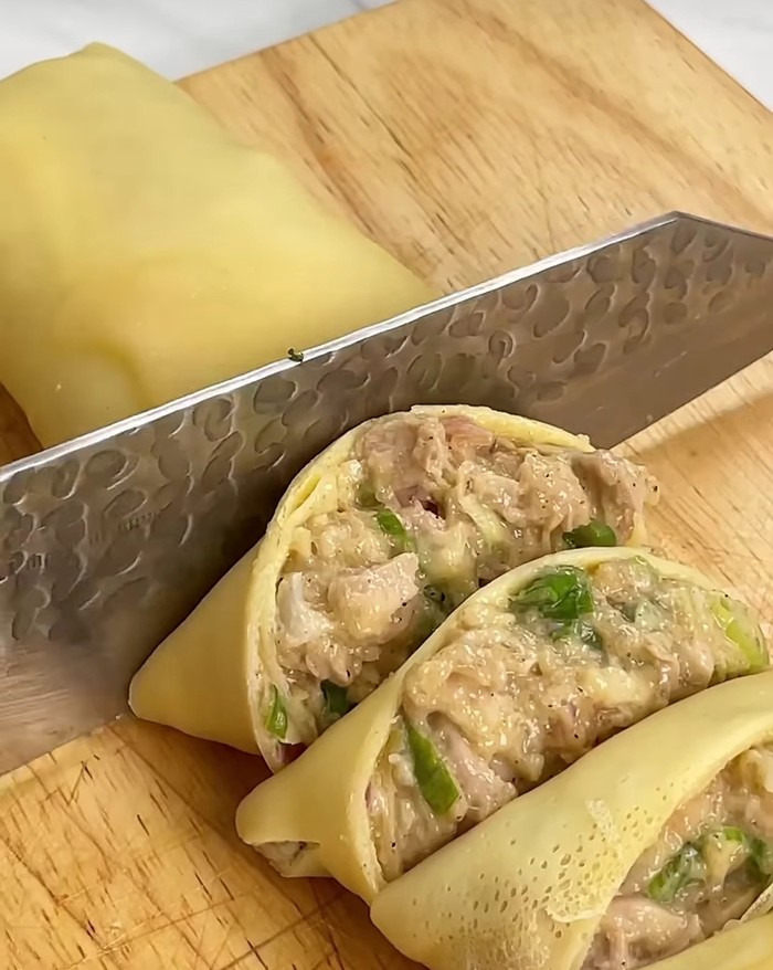 - Panaskan wajan, tuang sedikit adonan kulit lalu ratakan, masak dengan api kecil hingga pinggiran kering. Ulangi sampai adonan habis.