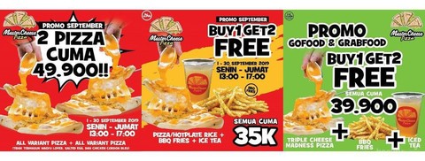 Foto: https://instagram.com/mastercheesepizza?igshid=on79o6wkpo4wPada bulan September ini, Master Cheese Pizza sedang melakukan promo hemat September, dengan pembelian paket hemat 2 pizza, Ladies cukup membayar seharga Rp49 ribu, ada juga promo buy 1 get 2, hanya dengan membayar Rp35 ribu, dan terakhir ada promo go-food & grab-food buy 1 get 2, hanya dengan membayar Rp39 ribu.