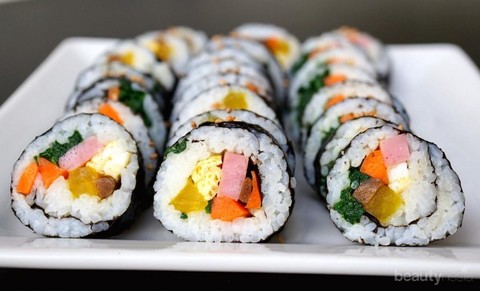 Sushi roll versi Korea ini sekilas memiliki tampilan yang terlihat berantakan, tapi saat dipotong kamu akan melihat berbagai macam warna warni indah dari bahan makanan yang digunakan. Seperti daging sapi, wortel, rumput laut, acar lobak kuning, dan telur. Cocok untuk bekal makan siang yang bergizi dan praktis untuk dibawa.