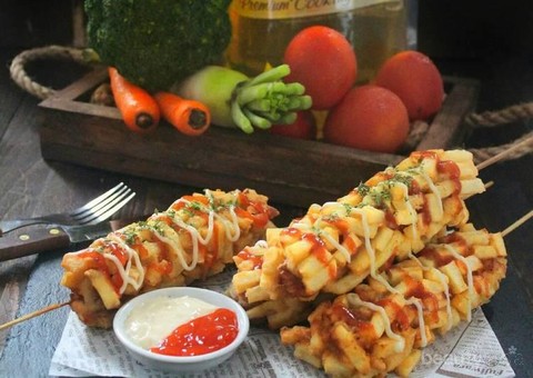 Tteokkebi hot dog atau dikenal French Fried Corn Dog adalah street food Korea selanjutnya yang mengugah selera. Tteokkebi hot dog adalah sebuah makanan berbahan dasar sosis yang baluri dengan potongan kentang goreng yang kemudia di goreng dan di beri saus mayonaise atau saus sambal.