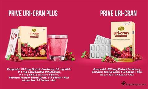 Prive Uri-cran juga memiliki efek anti perlengketan bakteri e-coli di dinding saluran kemih. tersedia dalam sediaan kapsul dan serbuk siap minum, Prive Uri-Cranjuga aman dikonsumsi oleh wanita hamil dan menyusui.