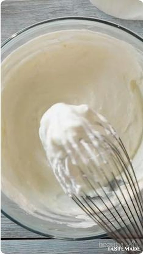 - Pindah ke wadah yang lebih besar, kemudian masukan kembali 1/3 putih telur lagi, aduk rata.