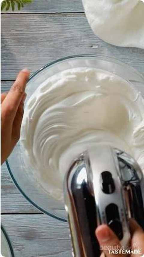 - Kocok putih telur dengan mixer kecepatan tinggi selama 10 detik dan masukkan gula sedikit demi sedikit hingga habis dengan mixer kecepatan sedang.