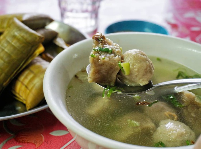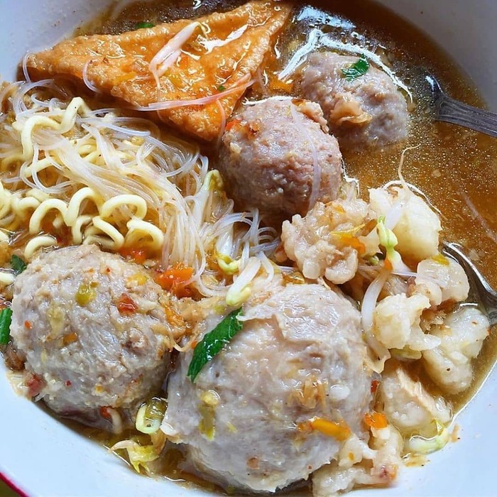 Bakso dengan rasa daging yang kuat dan lembut ini bisa disajikan dengan bihun dan mie kuning. Ditambah dengan kuah kaldu yang gurih karena direbus dengan tulang sapi, membuat rasanya semakin lezat. Selain itu, makan bakso di sini juga enak karena dipadukan dengan sate kerang. Seporsi bakso di warung ini dibanderol sekitar Rp 33.000.