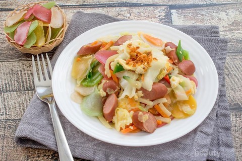 - Setelah terlihat empuk masukan kerupuk dan kwetiau bersamaan, campurkan dan aduk hingga sedikit mongering.