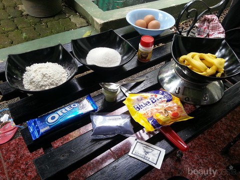 3 butir telur, 100 gram gula pasir, 100 gram tepung terigu, 100 gram margarin lelehkan, 1 bungkus vanili bubuk, 1/4 sdt soda kue, 1/2 sdt baking powder, dan topping (keju parut, oreo, green tea bubuk, dll).
