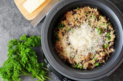 Untuk memasaknya, masukkan ke dalam rice cooker bumbu yang sudah dihaluskan, lalu ikuti dengan memasukkan nasi. Campur semuanya seperti memasak nasi goreng. Risotto biasa disiram sedikit demi sedikit dengan air kaldu pada saat proses pengadukan, namun dengan rice cooker kamu bisa langsung saja menyiram semua air kaldu ke dalam rice cooker, lalu tutup dan nyalakan tombol 'cook' untuk memasaknya sampai matang. Praktis, kan?
