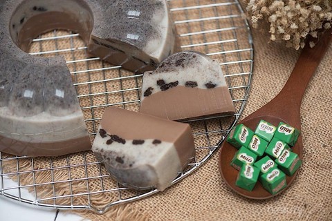 - Taburkan sedikit bubuk orea pada cetakan yang telah disediakan lalu tuangkan adonan agar-agar putih. Tabur kepingan oreo yang telah dipotong asal diatas adonan agar-agar putih, tunggu sampai adonan membeku.