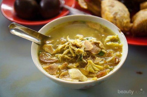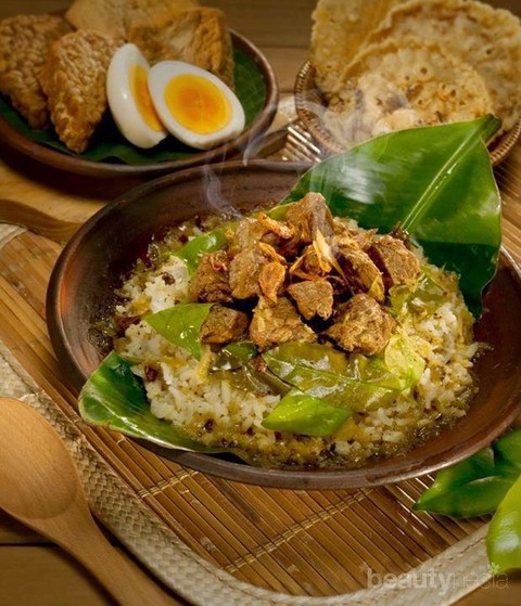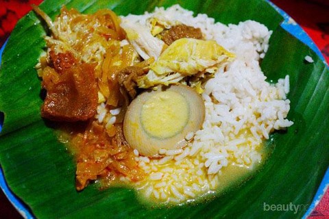 Kalau belum pernah mencoba panganan ini, mungkin kamu akan kesulitan membayangkannya. Isinya nasi gurih, sayur labu pedas, tahu, telur rebus, dan suwiran ayam, kemudian dituangi kuah opor. Rasanya gurih dan sedikit pedas. Kalau ingin lebih gurih, kamu dapat menambahkan sendiri santan kental yang disediakan. Harganya di bawah Rp 10.000 saja!