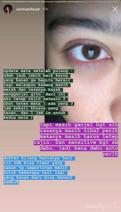 Aktris sekaligus penyanyi, Salshabilla Adriani baru saja mengalami kejadian yang mengerikan. Beberapa waktu lalu, ia mengunggah foto dirinya dengan sebelah mata yang tertutup. Salshabilla hampir saja mengalami kebutaan karena infeksi pada kornea matanya.