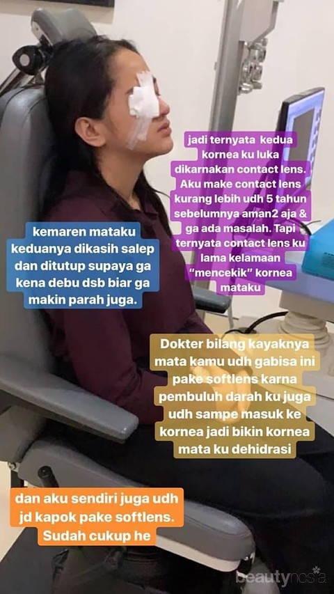 Teman-teman Salsha pun langsung membantunya pergi ke Siloam Hospital. Namun setelah diperiksa, dokter di Siloam langsung merujuk Salsha ke Jakarta Eye Centre karena kedua kornea matanya mengalami luka yang cukup besar. Luka pada kedua kornea mata Salsha pun diakibatkan dari softlens yang ia kenakan. Salsha mengatakan bahwa ia sudah menggunakan softlens selama kurang lebih 5 tahun dan baik-baik saja selama ini. Namun, kali ini softlens yang dikenakan Salsha mencekik kornea matanya. Ngeri banget ya?