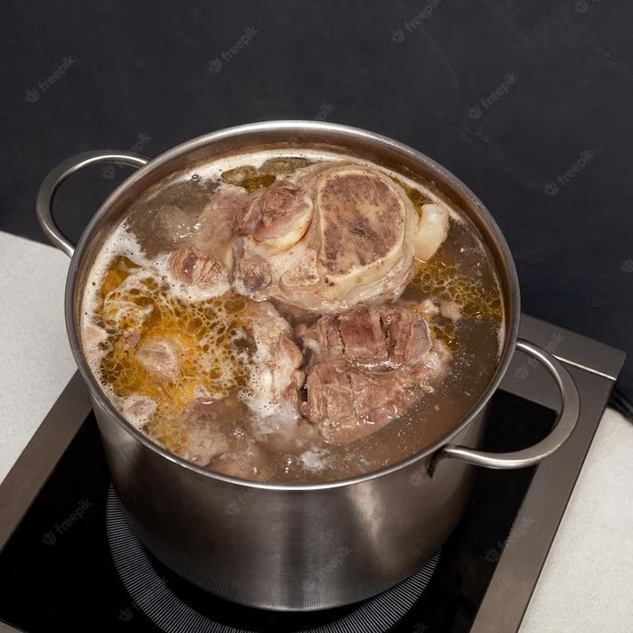 Pertama, siapkan panci berisi air. Masak air sampai benar-benar mendidih, lalu baru masukkan potongan daging yang ingin dimasak. Rebus selama 5 menit dengan posisi panci ditutup.