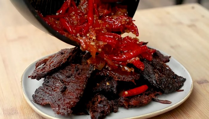 Masakan khas Sumatera Barat ini dibuat dari daging sapi yang diiris tipis, dipukul-pukul (batokok), lalu dibakar atau digoreng hingga kering. Bumbu cabainya ditumis tanpa santan, menghasilkan rasa pedas dan gurih yang nikmat.