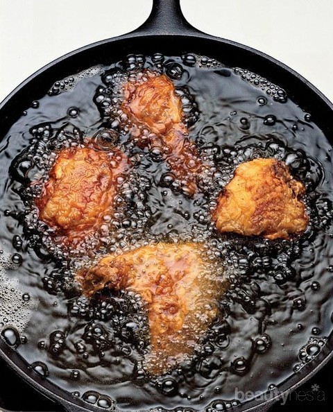 Panaskan minyak dalam deep fryer pan panaskan dengan api sedang . Basahi setiap potongan ayam dengan sedikit air, lalu celupkan ke dalam campuran kering. Pastikan bumbu kering tidak berlebih dan celupkan dalam campuran basah, lalu celupkan kembali dalam campuran kering sekali lagi.