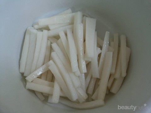 1/2 bagian dari satu buah lobak putih ukuran besar, lalu iris tipis dan memanjang seperti ini: