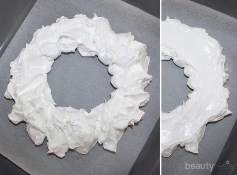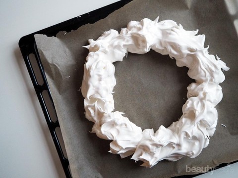 - Siapkan nampan oven yang sudah dilapisi dengan baking paper. Gambarlah lingkaran sebesar 15cm ditengah kertas. Gunakan dua sendok untuk membentuk meringue menjadi sebuah bulatan besar dan letakkan secara melingkar dan berdampingan. Lakukanlah hingga cuma menyisakan kurang lebih 15 diameter pada bagian tengahnya. Kurang lebih kamu harus membuat 15 bulatan meringue secara melingkar, maka dari itu akan lebih mudah jika kamu sudah menggambarnya pada baking paper yang sudah disiapkan.