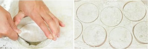 Foto: https://www.justonecookbook.com/mochi-ice-cream/8. Ambil mochi dari lemari es dan potong 7-8 bulatan dengan cookie cutter. Jadilah bungkus kue mochi. Sisa adonan mochi, masih dapat digulung lagi lalu digiling tipis kemudian dipotong membentuk lingkaran menggunakan cookie cutter.