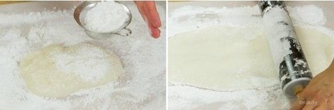 Foto: https://www.justonecookbook.com/mochi-ice-cream/ 6. Untuk menghindari adonan menjadi lengket, taburi lagi tepung diatas mochi. Giling tipis adonan mochi dengan penggiling kue.