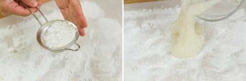 5. Taburi tepung kentang atau tepung maizena diatas meja, kemudian letakkan adonan mochi yang sudah matang diatasnya.