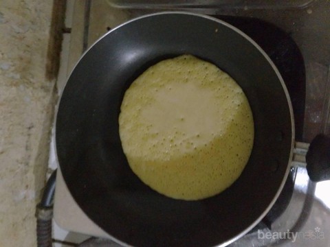 • Tuangkan adonan kira-kira 2,5 sendok sayur, ratakan, lalu tutup teflon.