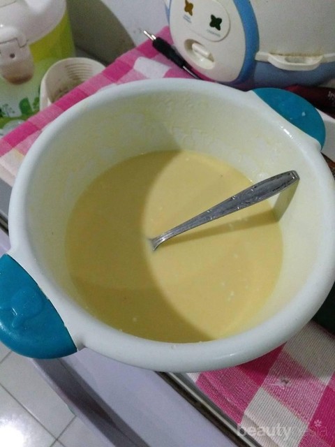 • Masukan tepung terigu, kuning telur, dan garam. Aduk secara merata dengan spatula sampai semua bahan tercampur serta halus.